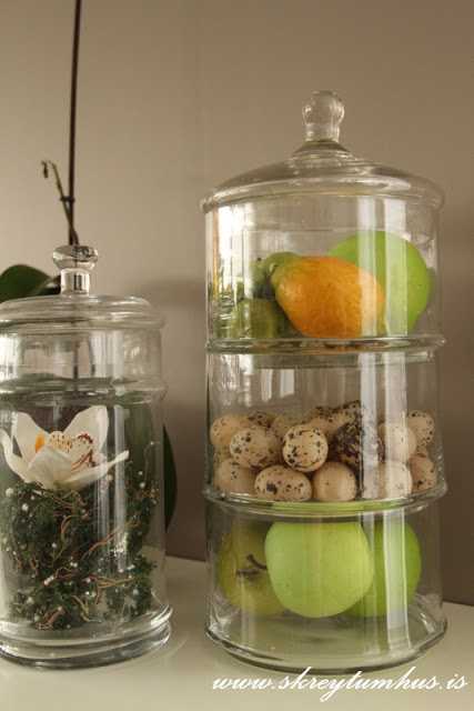 Ég setti lítil gerviepli, stór gerviepli og sítrónur, og gerviegg í krukkuna mína.