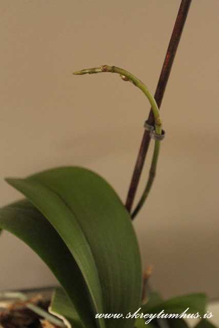 …í glervasanum eru tvær orkídeur saman og önnur þeirra er núna að koma með blóm – jeyyyyy!