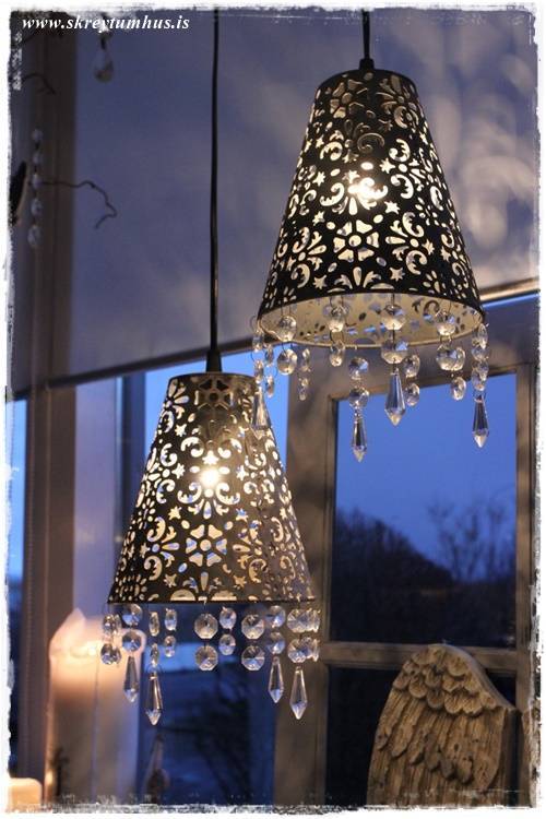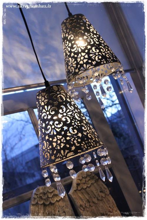 …ég átti sem sé nokkra svona “kristalla” eða bara glerglingur, hérna heima og ákvað að skella þeim neðan í ljósin mín fínu…