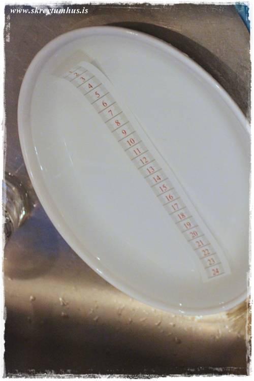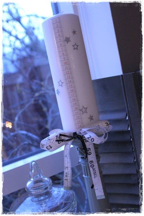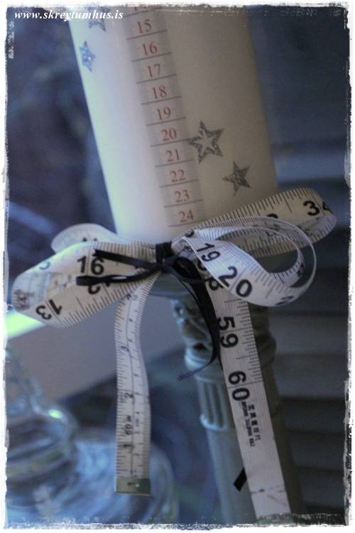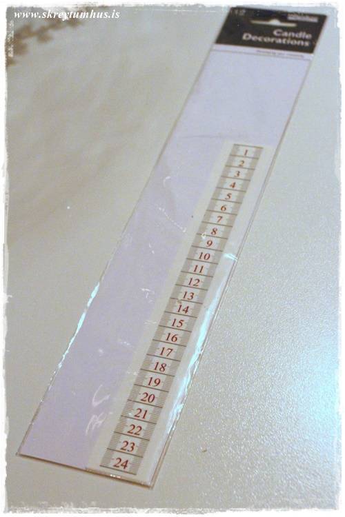 …síðan munið þið eftir aðventukransinum góða.  Sem ég setti á svona kertatattoo (sjá hér), á sama tíma fékk ég í A4 þetta hérna, og hugsaði mér því gott til glóðarinnar að útbúa mér dagatalakerti…