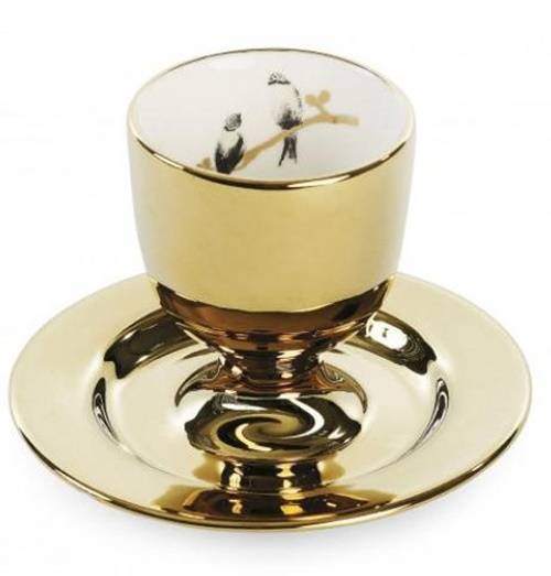 Eins og t.d. þessi hérna eggjabikar, sjáið þið bara litlu fuglana sem sitja þarna innan í – hversu fallegur væri þessi á fallegu matarborði, kemur í gulli og silfri…