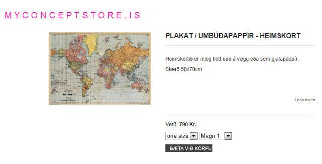 Ég á í ástarsambandið við kort þessa dagana, kort og hnetti – eins og margt oft hefur verið talað um áður á þessu litla bloggi mínu. Því rak ég upp hamingjuóp um daginn þegar að ég fór inn í My ConceptStore í Kópavogi (er líka með frábæra vefverslun hér) og fann gjafapappír hjá þeim. Pappírinn er nefnilega þykkur og alveg jafnflottur í ramma sem plakat eða bara beint upp á vegg.