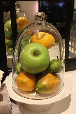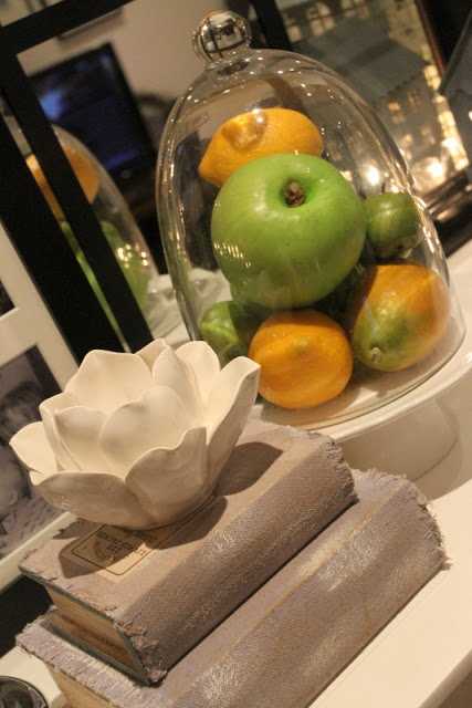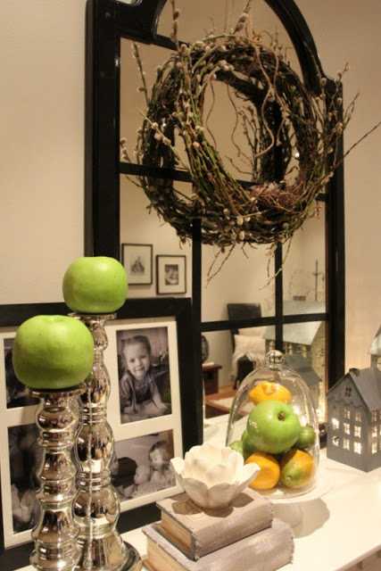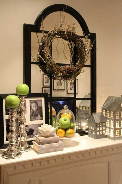 …síðan skreytti ég arinhilluna með grænu og gulu, eplum og sítrónum…