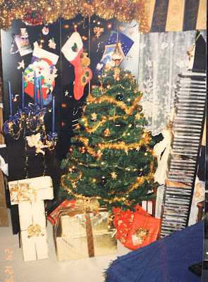 …og inni í herbergi litlu hjúanna var búið að mála neðri hlutann dökkbláann og efri ljósgulan, og þessi fíni kappi saumaður við.  Svo má dáðst að jólatrénu sem lítur út eins og einhver hafi ælt jólum yfir það allt – og auðvitað glitgarlandinu sem hangir á skilrúminu…
