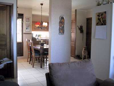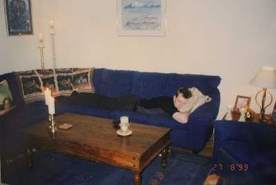 Þó að veggirnir hafi verið fölgulir þá er blái liturinn ekkert gleymdur og því dugaði ekkert minna en blátt hornsófasett og blár lazyboy (þessi langi lazyboy sem liggur í sófanum fylgdi samt ekki með honum)!