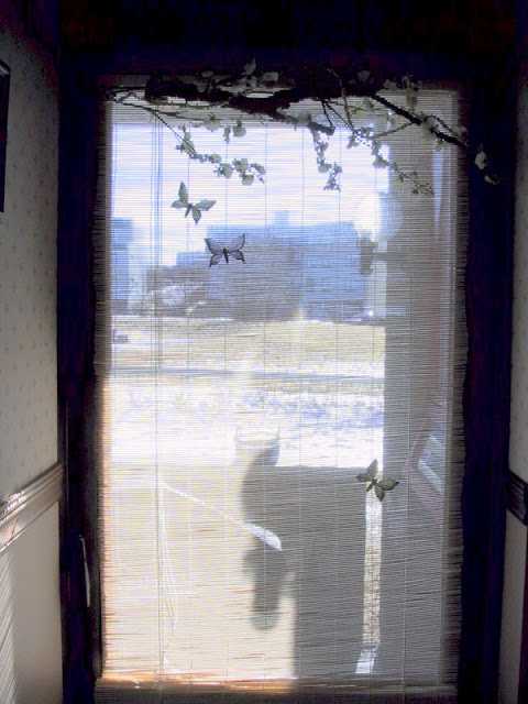 …festi grein fyrir ofan gardínuna og svo stakk ég litlum fiðrildum á gardínuna sjálfa…