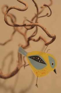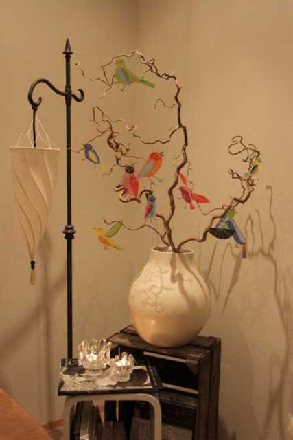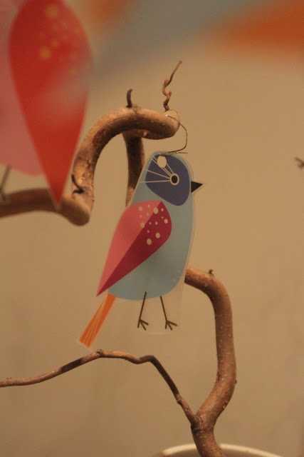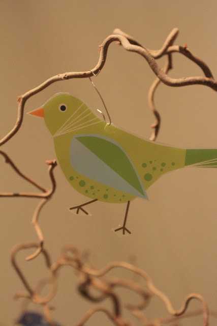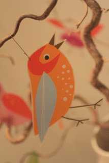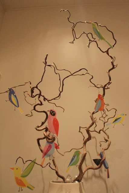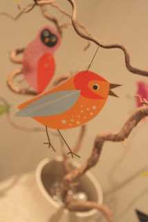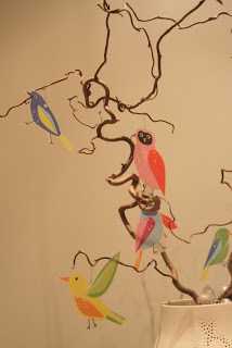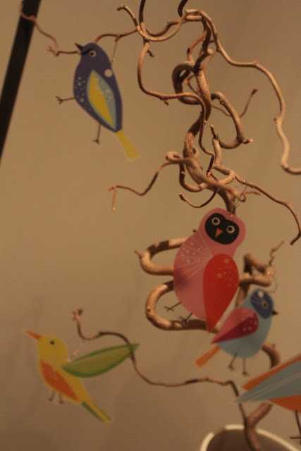 …ég sem sé klippti bara fuglana út af mottunni og notaði svo jólakúluvírhengi til þess að hengja þá upp á greinarnar í stofunni…