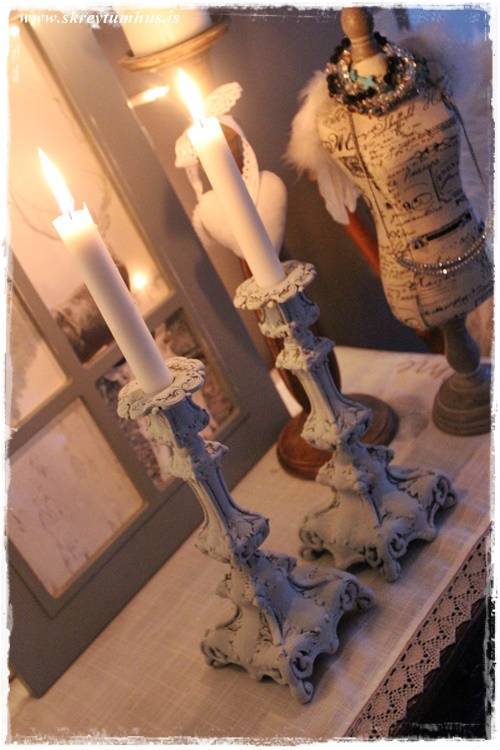 Hehe, sé þig fyrir mér með dagblað fyrir andlitinu (dagblaðið með tveimur götum fyrir augun) eða stóra pottaplöntu að elta grey konuna! 😉 En stjakarnir eru hrikalega flottir og ég er alveg að sjá þörfina á að kaupa mér kalkmálningu :p