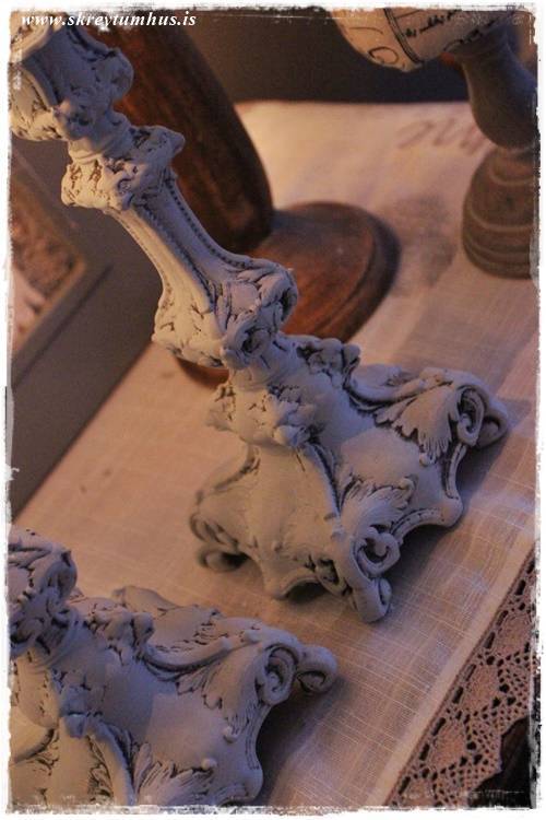 …og hér sjáið þið betur hvernig málningin þekur ekki allt saman. Þannig kom líka miklu betri vídd í stjakana…