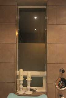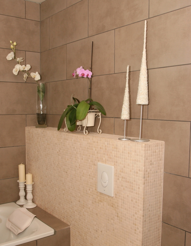 …við völdum okkur brúnbeisaðar flísar og síðan ljósar mósaík flísar með…