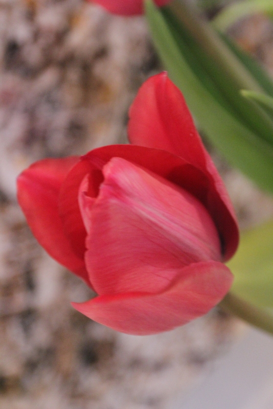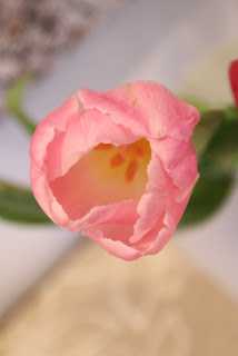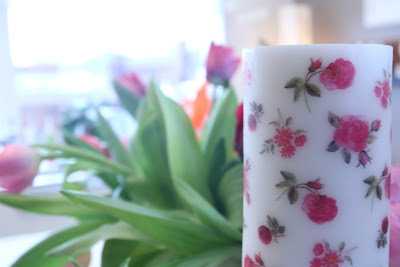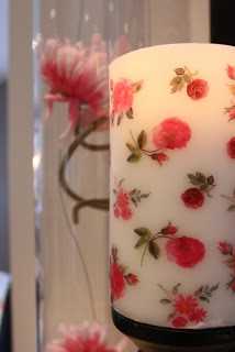 …ég setti stóra, langa glervasann minn á endann og víraði þrjú silkiblóm úr Ikea ofan í, síðan notaði ég þrjár gervirósir frá, og allir saman nú, Ikea, og dásamlegu, rómantísku kertin úr sænsku búðinni.
