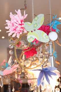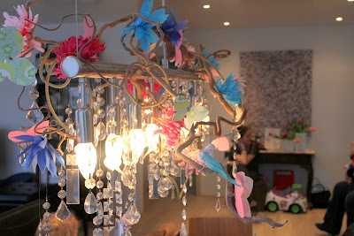 …ljósakrónuskrautið voru sem sé silkiblóm frá Ikea, heimalöguð bláblóm og heimalöguð fiðrildi, ásamt dásamlegu bíbbunum mínum (þið megið senda mér póst ef þið viljið fá nánari upplýsingar um þá)…