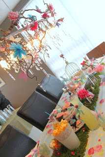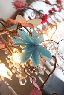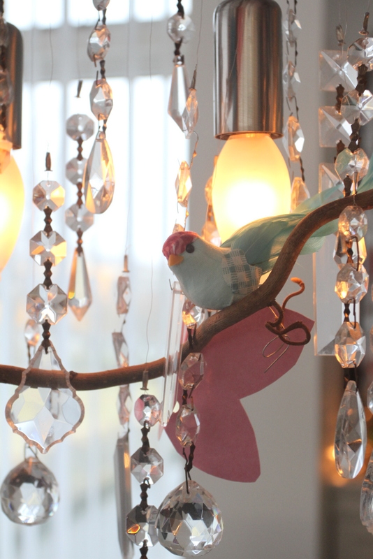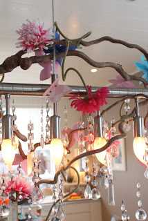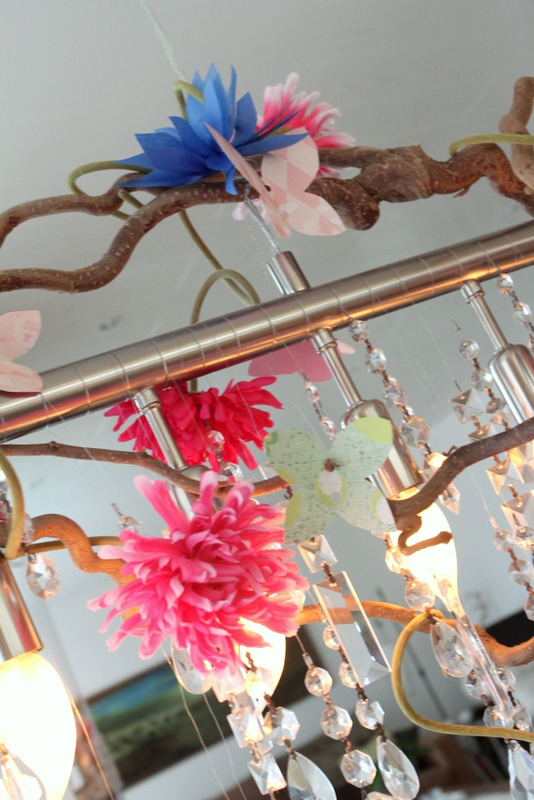 …ljósakrónan skreytt að vanda, bláu blómin og friðrildin eru DIY-verk sem ég skal sýna ykkur á næstunni en bleiku blómin eru snilld.  Þau koma frá, og þið getið aldrei upp á því 🙂  júúúú – Ikea!