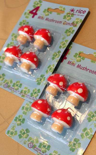 og fann þessi sveppakerti.  Halló!  Gætu þau verið fullkomnari á kökuna?? 🙂