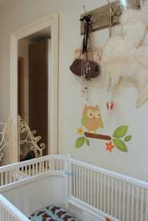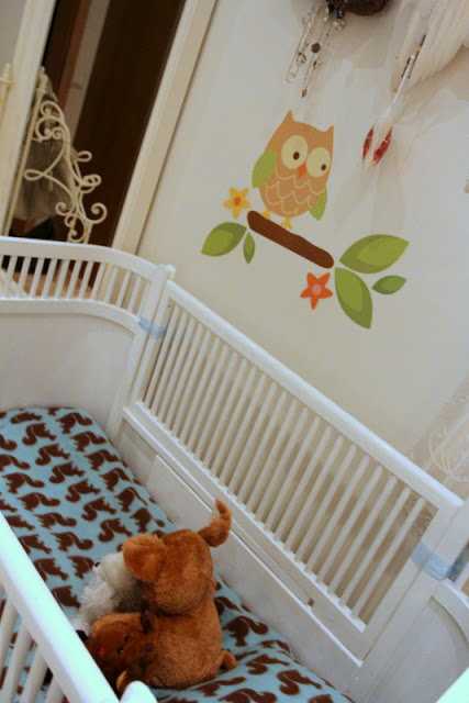…ég skellti uglulímmiða sem að ég átti á vegginn, svo að gaurinn gæti nú potað í eitthvað og fiktað…