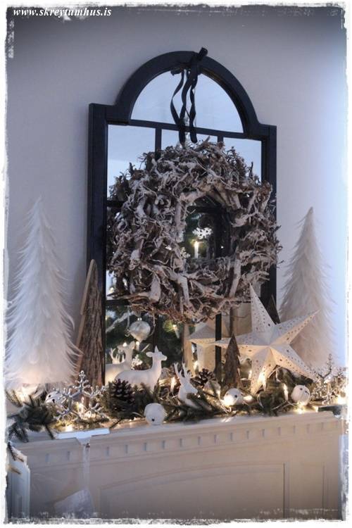 …sem síðan var fært í burtu – og þess í stað kom gervigreni úr Ikea (sem er æðislegt, raunverulegt og fallegt) og einfaldari skreyting. Tvískreyttur arin, það er bara kósý ekki satt?