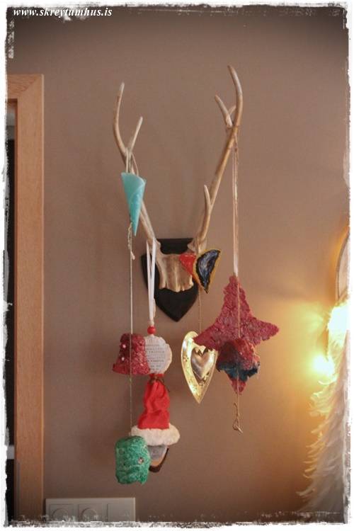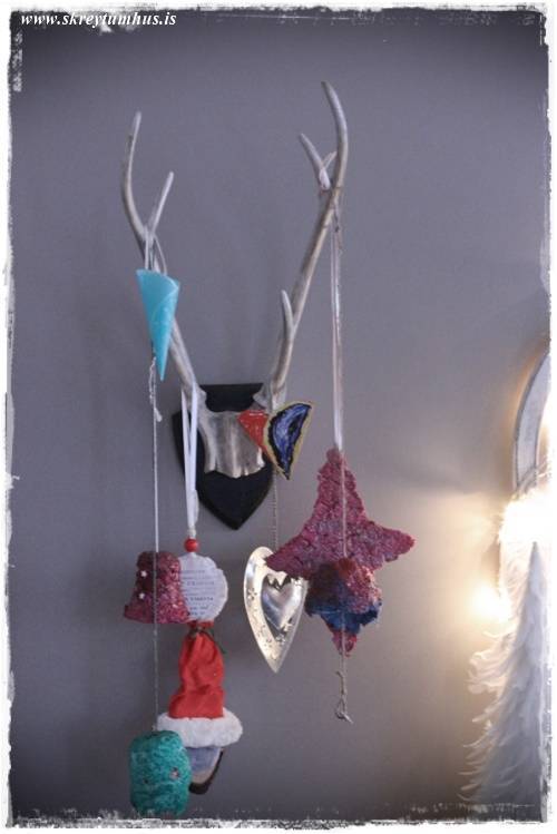 …svo talandi um að vera með allt á hornum sér – þá tóku hornin við alls konar hangandi skrauti sem að krakkarnir hafa gert…