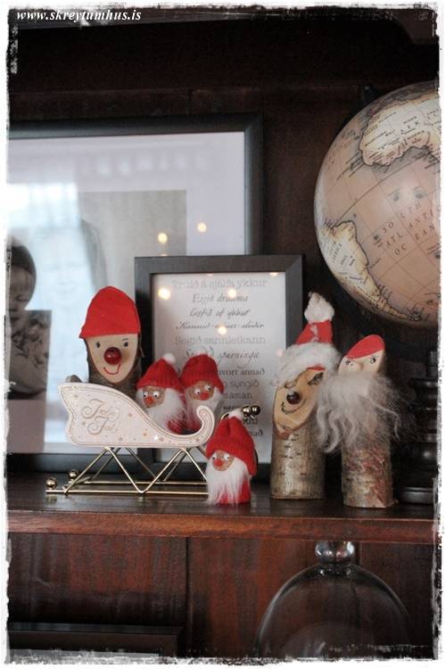 …þessir þrír timburmenn, sem við foreldrarnir gerðum í leikskóla hérna á seinustu öld, fengu félagsskap frá þremur korktoppasveinum sem dóttirin bjó í fyrra. Af timburmönnum og korktappasveinum mætti telja að hér sé mikil drykkja, en svo er reyndar ekki 😉