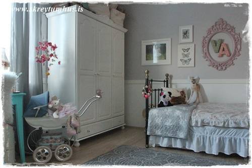 Því er ég búin að vera með opin augun fyrir nýju rúmi inni í herbergið hennar og sá síðan rétta rúmið auglýst inni á – auðvitað – Skreytum Hús sölugrúbbunni á Facebook! Nema hvað! Þess vegna er herbergið orðið svona…