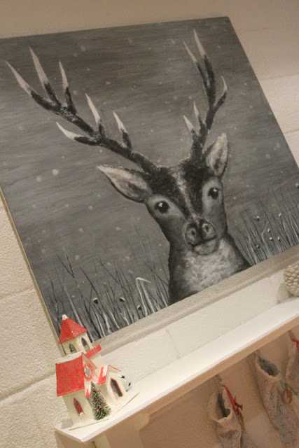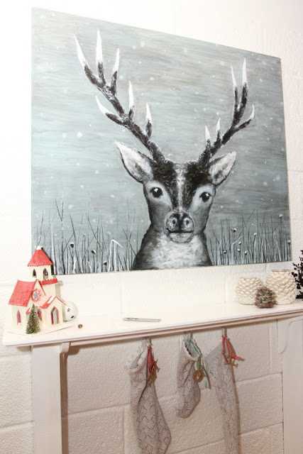 Snillingurinn málaði þessa geggjuðu hreindýramynd ásamt því að smíða sér “arinhillu” til þess að láta sokkana hanga á…