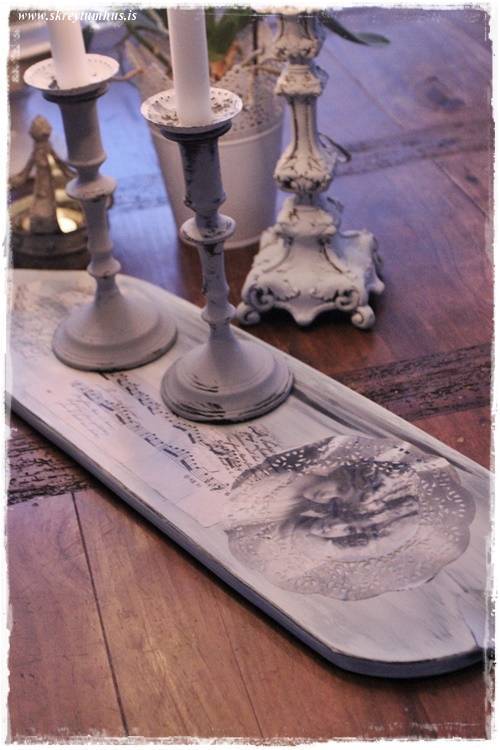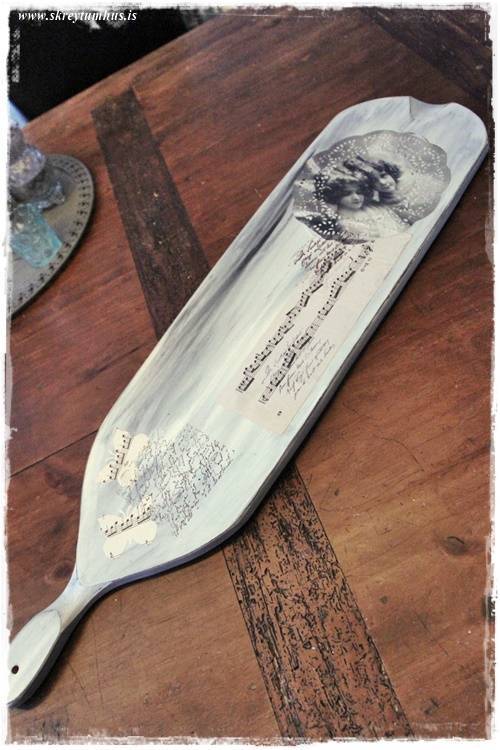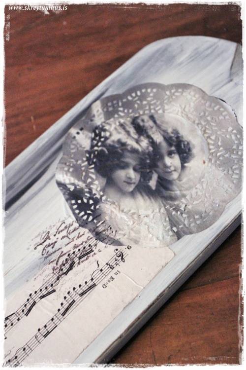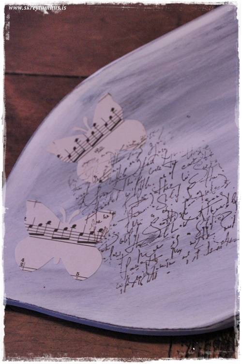 Ég átti enn eitthvað blúnduprent (sjá hér), frá tilraunastarfsemi minni hérna um árið, og ákvað að nota það á brettið. Síðan setti ég smá afklippu af nótnablaði og setti smá Script-stimpil (sjá hér) ofan á…