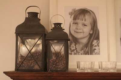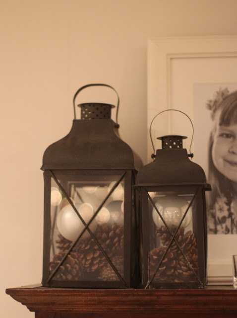 …luktirnar sem að stóðu úti í sumar, eru núna komnar upp á hillu – fylltar af könglum og kúlum!