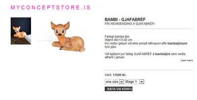 Ohh, ég elska þessa búð! Ég á Maríu Mey púðann frá þeim, Maríu Mey styttu, blómapúða, hringlaga púða með tölu í miðjunni, fullt af jólaskrauti (í uppáhaldi grái kertaljósabollinn – eins og var til í gamla daga)! Svo er ég búin að panta og borga einn Bamba sem að Máninn minn fær í jólagjöf! Þessi búð er ein af mínum uppáhalds 😉 Mæli með henni!!!