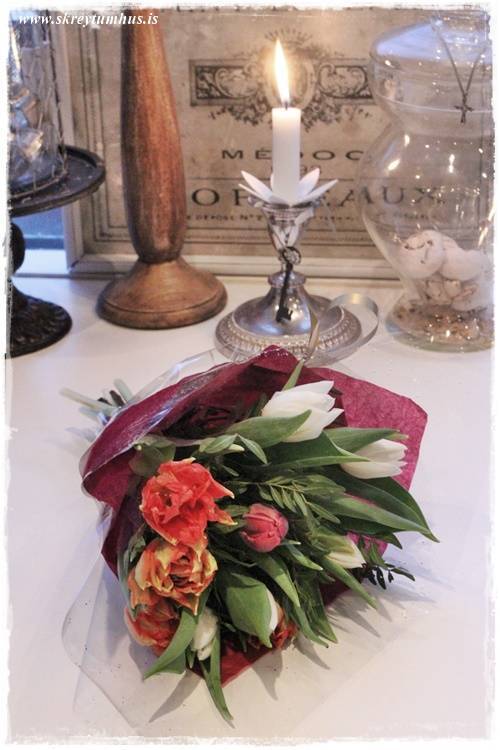 …reyndar er best að byrja á því að á leiðinni kom ég við í Garðheimum, og kippti með mér einum “Blómvendi mánaðarins“, sem er nýjung hjá þeim.  Að þessu sinni var það fallegur blandaður túlípanavöndur með grænu og ekki er nú leiðinlegt að fá blessaða túllana í hús…