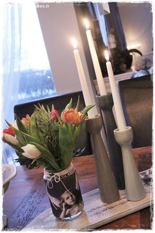 …ég tók síðan vöndinn og setti hann í “blómavasa” ásamt kertastjakatríó-inu sem fylgdi mér heim úr Rúmfó…
