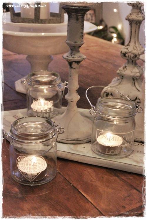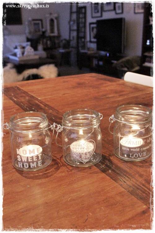 …þessir stjakar komu í þessari litasamsetningu, og líka í bleikum tónum, og kostuðu eitthvað um 1400 kr fyrir alla þrjá.  Snilldin er síðan að hægt er að nota líka sprittkerti í stjakana…