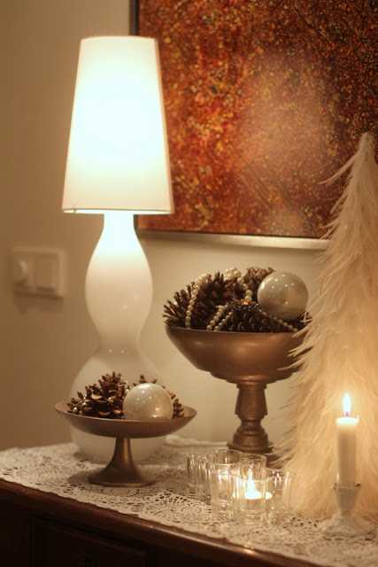 …heimalöguðu skálarnar njóta sín vel með könglum og kúlum