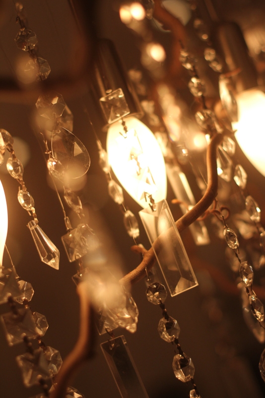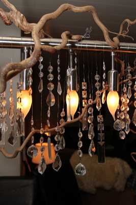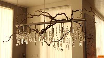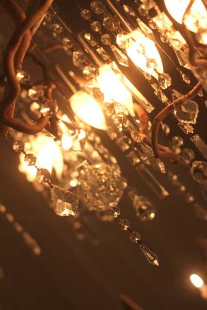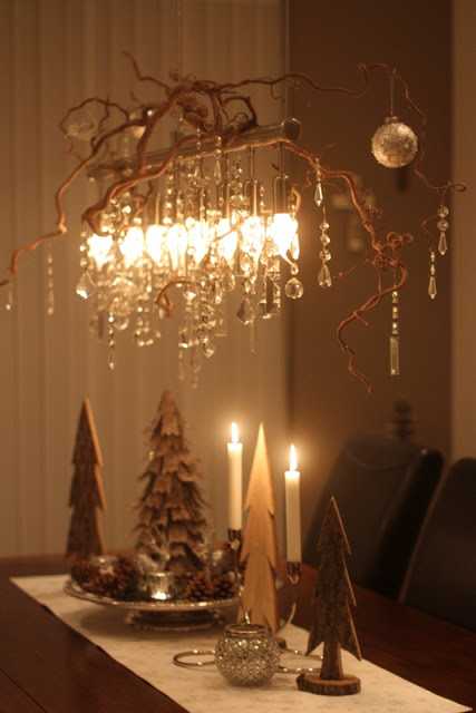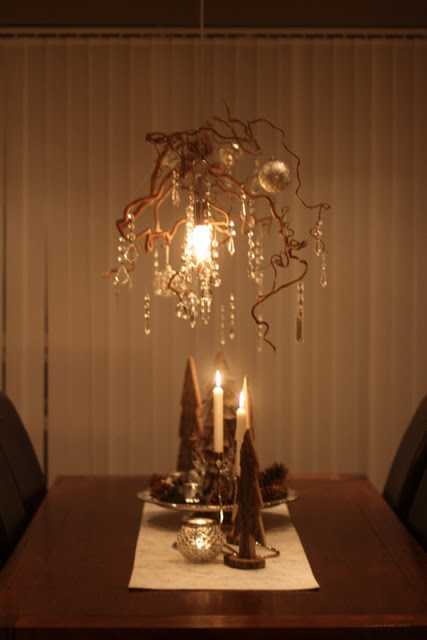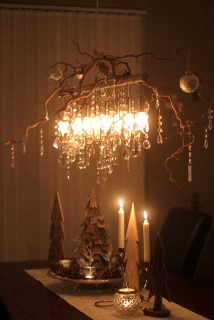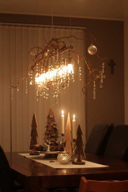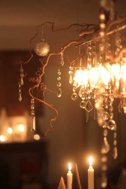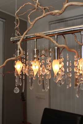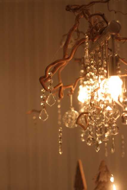 Ég gerði svona ljósakrónu fyrir morgun árum ( aðeins úr greinum og kristöllum og glærri jólaseríu)