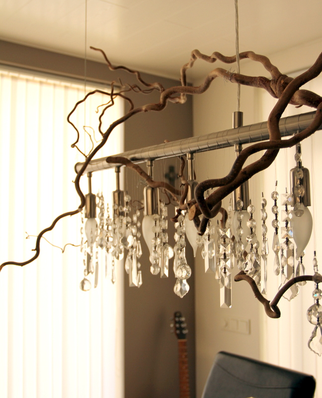 Ég gerði svona ljósakrónu fyrir morgun árum ( aðeins úr greinum og kristöllum og glærri jólaseríu)