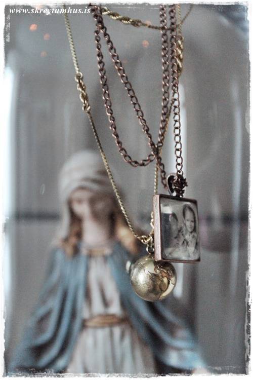 …þarna sjást einmitt tvo mjög svo uppáhaldsgull, festin með mynd af krökkunum mínum, og síð gullfesti frá henni mömmu með hnettinum á…