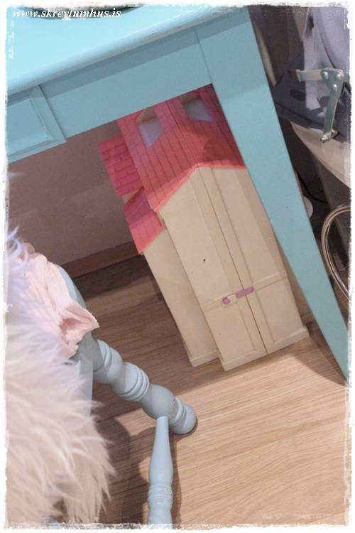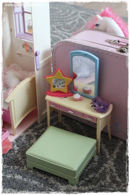 …búið að raða á snyrtiboðið grímu og öðru smálegi. Síðan er skemmtilegt að sjá skemilinn sem á að fylgja sófasetti fá nýtt hlutverk – út fyrir kassann – aftur, dóttir hennar mömmu sinnar…