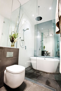 Þau voru með geggjað baðherbergi, settu bæði sturtu og baðker fyrir innan glervegg og gerðu það sem var kallað wet room. Ótrúlega sniðug og óvenjuleg laun 🙂