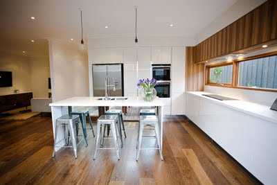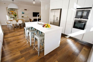 …það gæti mjög auðveldlega virkað kalt, en þar sem að það er svo mikill hlýleiki í viðnum á gólfinu og á gluggaveggnum, að eldhúsið virkar hlýlegt og notalegt.