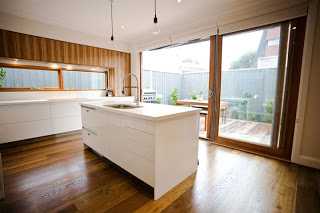 Flott að sjá viðarskápana í kringum gluggann, þeir hverfa einhvern veginn og eldhúsið virkar stærra…