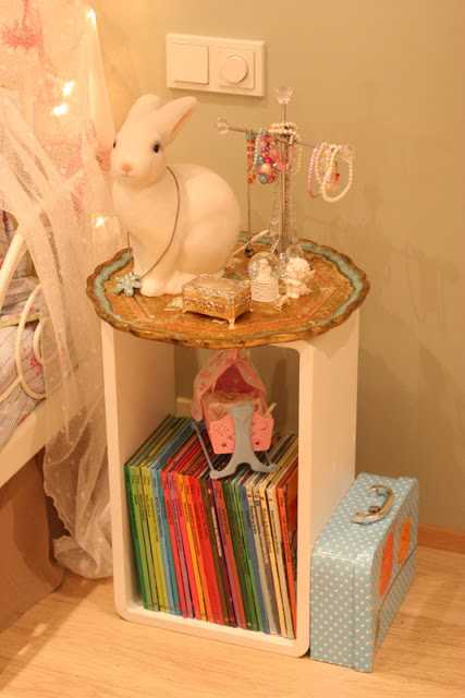 Eins og áður hefur verið sýnt þá notaði ég hvíta kassa úr Söstrene Greenes ásamt bakka, til þess að útbúa náttborð í herbergi dömunnar…