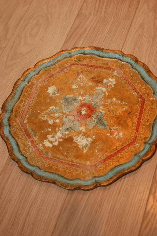 Ég þoli ekkert gyllt þannig að ég myndi mála rammann og vegghilluna fyrst dökkbrúna og svo hvítt yfir með frekar möttu, kannski kalkmálningu eða akrylgrunni og pússa svo þannig að þetta brúna komi í gegn. Svo mætti jafnvel setja blaðsilfur á slaufuna á rammanum… Myndi allavega ekki spreyja þetta hvítt, verður of “plastlegt” en kannski í öðrum lít, stóllinn kemur rosavel út í bláa litnum. Kannski bara eins fyrir borðið. Brilljant hugmynd að gera bekk úr því.
