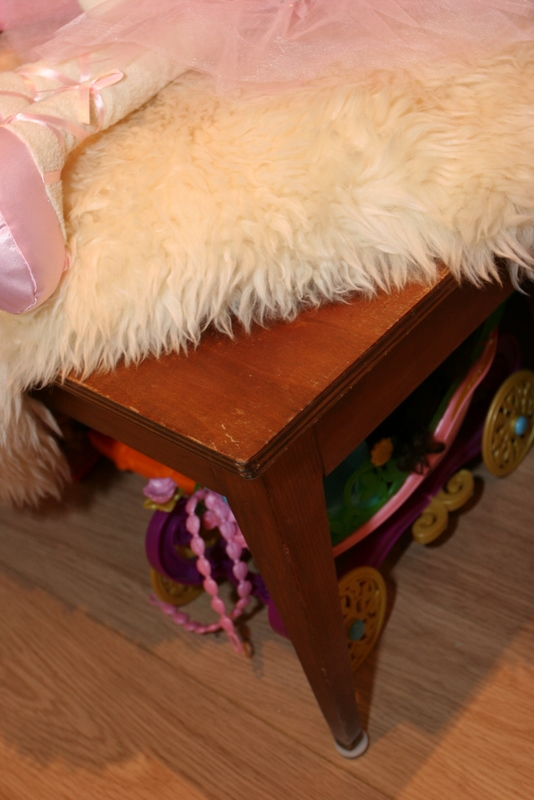 …síðan áttum við þetta gamla, litla borð frá ömmu eiginmannsins – ég er mikið að hugsa um að bólstra það og breyta því þannig í bekk við endann á rúminu.