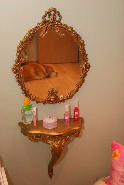 ómæ hvað herbergið er falleg, finnst spegillin og borðið æði og passar alveg að hafa þetta gyllt til að byrja með svo kannski seinna að spreyja þetta í einhverjum lit.
