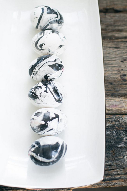 Því mæli ég með að þið blásið úr nokkrum eggjum, takið gamalt ísbox (eða annað slíkt sem má henda), kaupið svart og hvítt naglalakk ódýrt (t.d. í Megastore), og notið einnota hanska. Setið t.d. vír, eða opnaða bréfaklemmu, innan í gatið á egginu til þess að halda því.