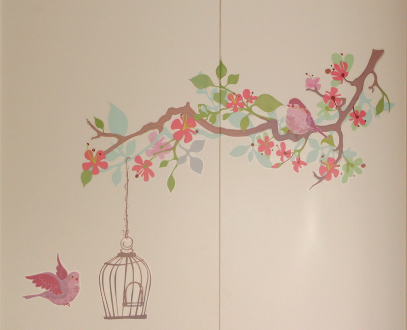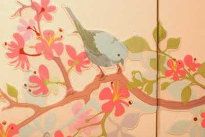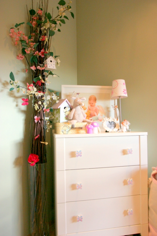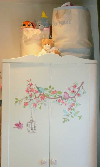 Greinarnar verða að einskonar tré fyrir fuglahúsið, og þær koma með dökka liti og tóna inn í herbergið.  Eins og ég sagði, allt sem að hjálpar til þannig að þetta verði ekki að pastelsykurpúða.