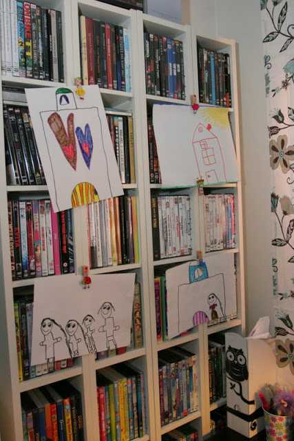 …ég hengdi upp klemmurnar úr Tiger á Billy-geisladiskarekkana, þannig að sú stutta getur verið með málverkasýningu á nýjustu verkunum um leið og þau verða til 🙂