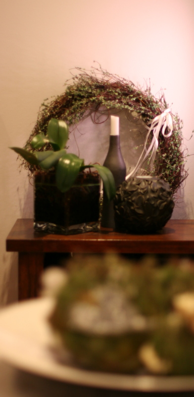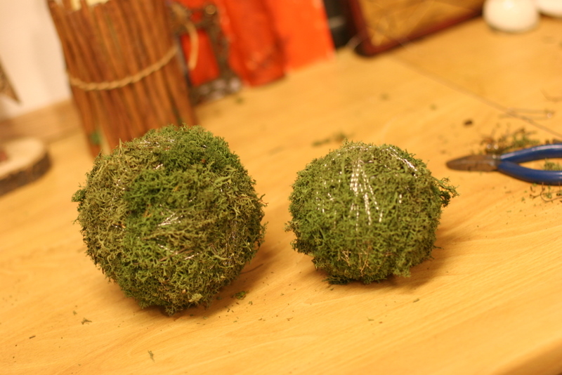 …finnst skemmtilegt hvernig að “grófleiki” mosakúlanna tengist saman við kransinn á sjónvarpsskápnum, og hvernig kúluformið tengist við kúlukertastjakann 🙂