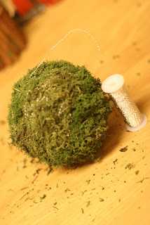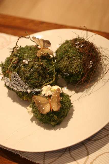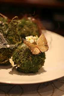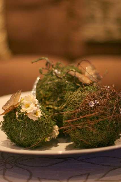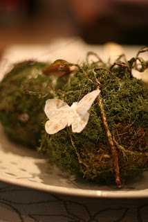 Um daginn var ég í Blómavali og sá þar svo fallegar mosakúlur sem að flott væri að hafa í stóra diskinum sem ég er með á stofuborðinu (er venjulega með hnettina þar, en það er alltaf gott að breyta til :).
