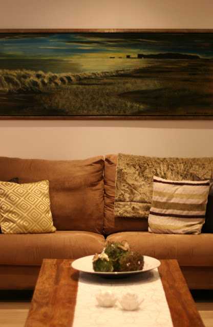 …meira grænt, tengir saman myndina, púðanna og nú borðskrautið