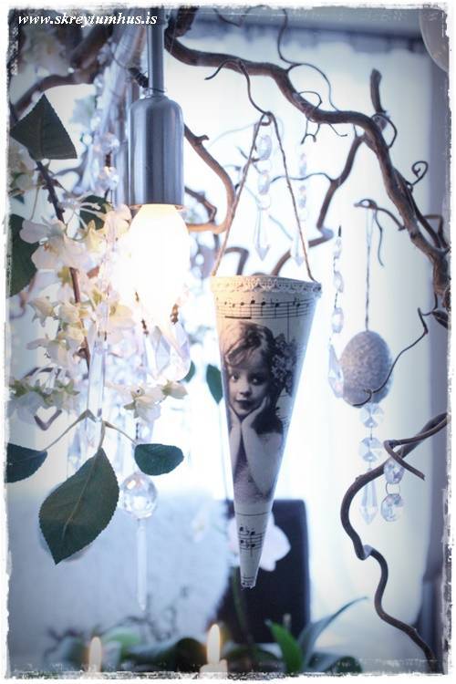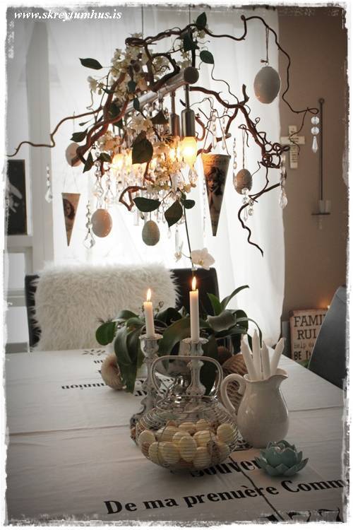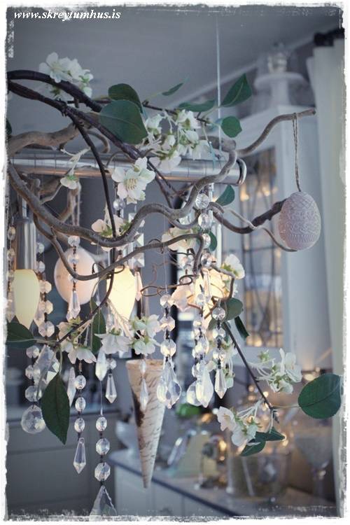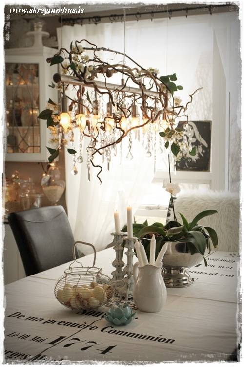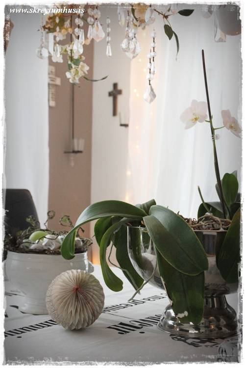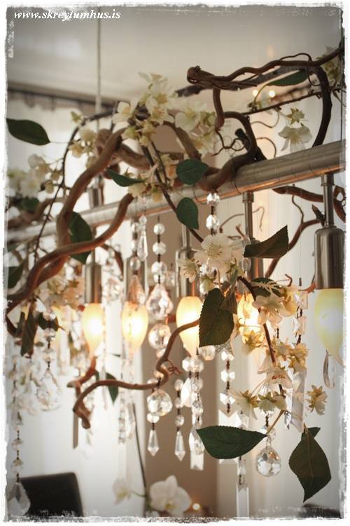…í ljósakrónuna setti ég tvær greinar með hvítum blómum, sem minna mig smá á eplatrén í blóma, sem ég horfi á myndir af á hverju ári en hef aldrei séð…