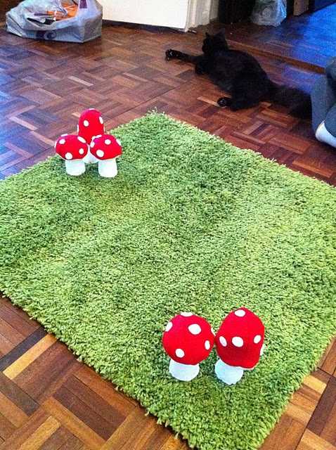 Sveppirnir eru síðan límdir með límbyssu á teppið en ef ég væri að útbúa þetta þá myndi ég hreinlega sauma þá niður í teppíð.  Langeinfaldast!